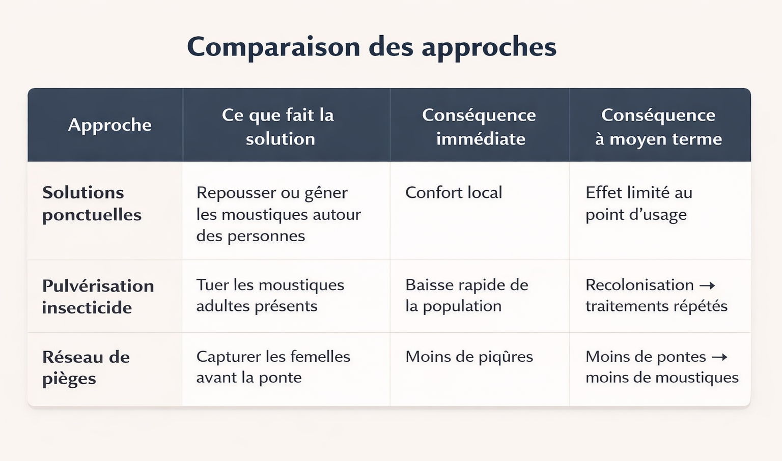 Une logique de protection systémique, dans laquelle un réseau de pièges dimensionné intercepte les moustiques avant la piqûre et agit progressivement sur la dynamique de population.